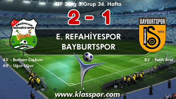 TFF 3.Lig 3.Grup 34. haftasında E. Refahiyespor ile Bayburtspor Erzincan 13 Şubat Stadı'nda bir araya geldi. Karşılaşmayı E. Refahiyespor 2-1 kazandı.