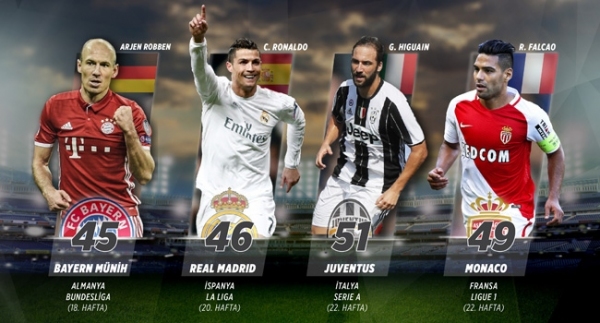 Almanya'da Bayern Münih, İspanya'da Real Madrid, İtalya'da Juventus, Fransa'da ise Monaco haftayı lider kapadı.