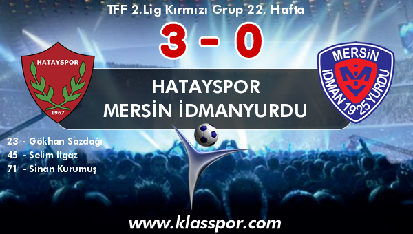 TFF 2.Lig Kırmızı Grup 22. haftasında Hatayspor ile Mersin İdmanyurdu Antakya Atatürk Stadı Stadı'nda bir araya geldi. Karşılaşmayı Hatayspor 3-0 kazandı.
