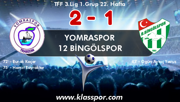 TFF 3.Lig 1.Grup 22. haftasında Yomraspor ile 12 Bingölspor Stadı'nda bir araya geldi. Karşılaşmayı Yomraspor 2-1 kazandı.