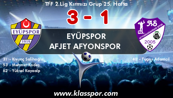 TFF 2.Lig Kırmızı Grup 25. haftasında Eyüpspor ile Afjet Afyonspor Stadı'nda bir araya geldi. Karşılaşmayı Eyüpspor 3-1 kazandı.