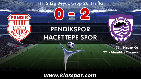 TFF 2.Lig Beyaz Grup 26. haftasında Pendikspor ile Hacettepe Spor Pendik Stadı'nda bir araya geldi. Karşılaşmayı Hacettepe Spor 2-0 kazandı.