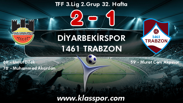TFF 3.Lig 2.Grup 32. haftasında Diyarbekirspor ile 1461 Trabzon Seyrantepe Diski Spor Stadı'nda bir araya geldi. Karşılaşmayı Diyarbekirspor 2-1 kazandı.