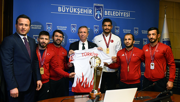 Yurda dönen şampiyon güreşçileri ilk kutlayan Ankara Büyükşehir Belediye Başkanı Mansur Yavaş oldu. Başkan Yavaş, makamında ağırladığı ASKİ Sporlu Güreşçileri ve yöneticileri tek tek tebrik etti.